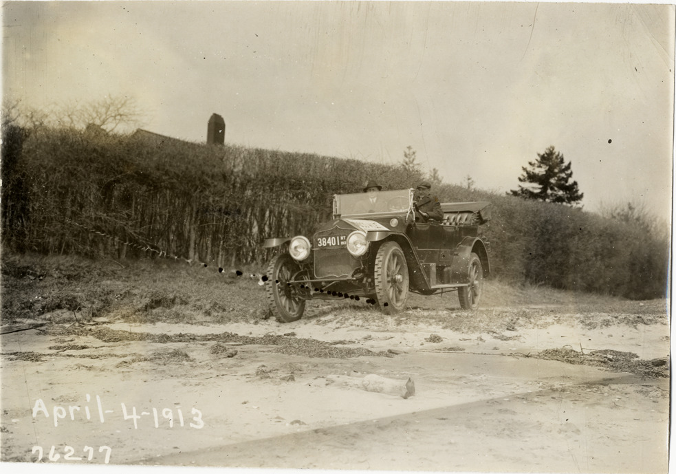 View of motorists in National car traveling on muddy rural road during the 1913 Overman tires 10,000 mile demonstration. The car was outfitted with a set of Overman cushion tires and driven over different routes and road surfaces within a 50 mile radius of New York, New York. Printed on front: "April-4-1913." Stamped on back: "Spooner & Wells, Inc., photographers, 1931 Broadway, N.Y. City, phones 3472-3473 Col." Handwritten on back: "Tours--Overman tires 10,000 mile demonstration, 1913."