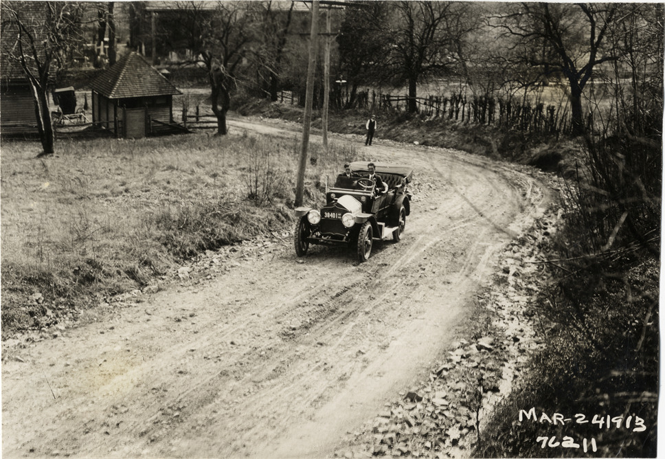 View of motorists in National car traveling on rural dirt road during the 1913 Overman tires 10,000 mile demonstration. The car was outfitted with a set of Overman cushion tires and driven over different routes and road surfaces within a 50 mile radius of New York, New York. Printed on front: "Mar-24-1913." Stamped on back: "Spooner & Wells, Inc., photographers, 1931 Broadway, N.Y. City, phones 3472-3473 Col." Handwritten on back: "Tours--Overman tires 10,000 mile demonstration, 1913."