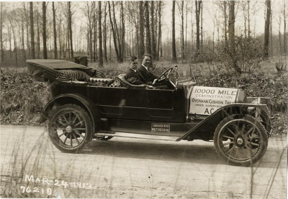View of motorists posing in National car during the 1913 Overman tires 10,000 mile demonstration. The car was outfitted with a set of Overman cushion tires and driven over different routes and road surfaces within a 50 mile radius of New York, New York. Printed on front: "Mar-24-1913." Stamped on back: "Spooner & Wells, Inc., photographers, 1931 Broadway, N.Y. City, phones 3472-3473 Col." Handwritten on back: "Tours--Overman tires 10,000 mile demonstration, 1913."
