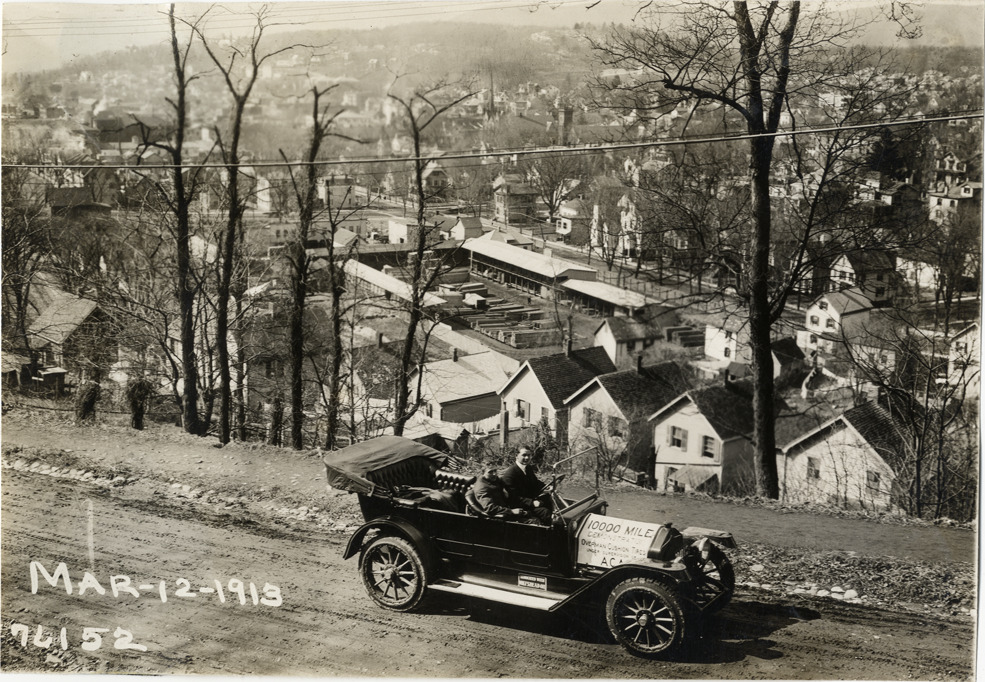 View of motorists posing with National car on hillside during the 1913 Overman tires 10,000 mile demonstration. Houses and commercial buildings are visible below road. The car was outfitted with a set of Overman cushion tires and driven over different routes and road surfaces within a 50 mile radius of New York, New York. Printed on front: "Mar-12-1913." Stamped on back: "Spooner & Wells, Inc., photographers, 1931 Broadway, N.Y. City, phones 3472-3473 Col." Handwritten on back: "Tours--Overman tires 10,000 mile demonstration, 1913."