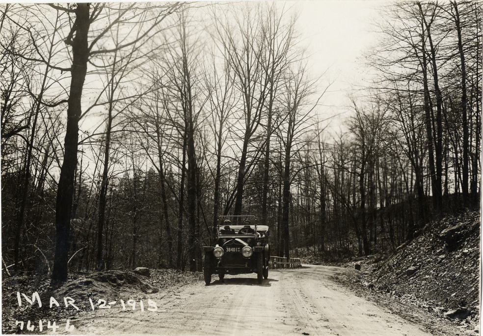 View of motorists in National car traveling on forest road during the 1913 Overman tires 10,000 mile demonstration. The car was outfitted with a set of Overman cushion tires and driven over different routes and road surfaces within a 50 mile radius of New York, New York. Printed on front: "Mar-12-1913." Stamped on back: "Spooner & Wells, Inc., photographers, 1931 Broadway, N.Y. City, phones 3472-3473 Col." Handwritten on back: "Tours--Overman tires 10,000 mile demonstration, 1913."