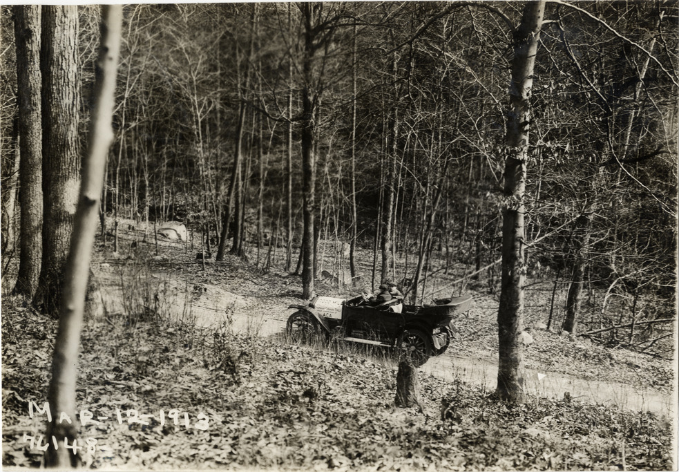 View of motorists in National car traveling on forest road during the 1913 Overman tires 10,000 mile demonstration. The car was outfitted with a set of Overman cushion tires and driven over different routes and road surfaces within a 50 mile radius of New York, New York. Printed on front: "Mar-12-1913." Stamped on back: "Spooner & Wells, Inc., photographers, 1931 Broadway, N.Y. City, phones 3472-3473 Col." Handwritten on back: "Tours--Overman tires 10,000 mile demonstration, 1913."