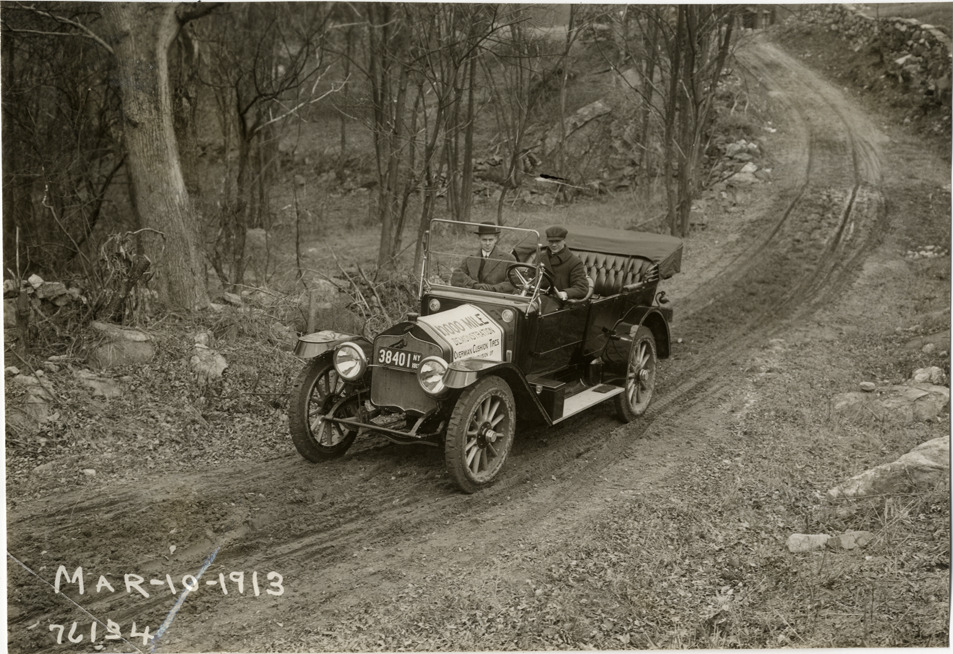 View of motorists in National car traveling on forest road during the 1913 Overman tires 10,000 mile demonstration. The car was outfitted with a set of Overman cushion tires and driven over different routes and road surfaces within a 50 mile radius of New York, New York. Printed on front: "Mar-10-1913." Stamped on back: "Spooner & Wells, Inc., photographers, 1931 Broadway, N.Y. City, phones 3472-3473 Col." Handwritten on back: "Tours--Overman tires 10,000 mile demonstration, 1913."