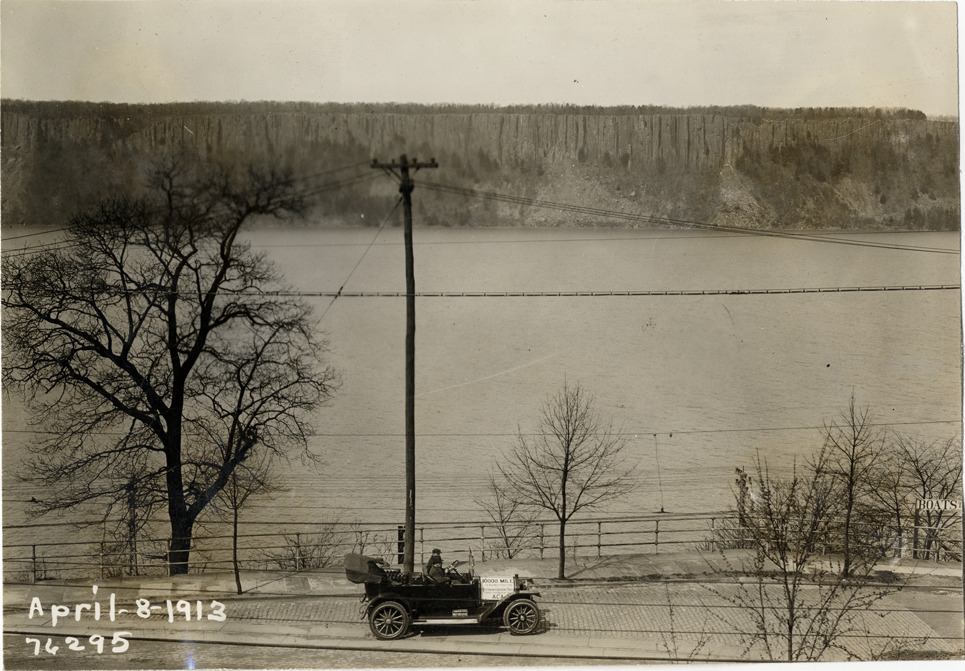 View of motorists in National car on road overlooking lake during the 1913 Overman tires 10,000 mile demonstration. The car was outfitted with a set of Overman cushion tires and driven over different routes and road surfaces within a 50 mile radius of New York, New York. Printed on front: "April-8-1913." Stamped on back: "Spooner & Wells, Inc., photographers, 1931 Broadway, N.Y. City, phones 3472-3473 Col." Handwritten on back: "Tours--Overman tires 10,000 mile demonstration, 1913."