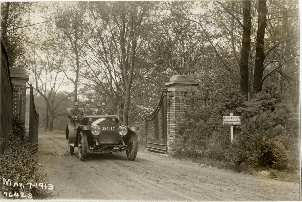 View of motorists in National car passing through gate during the 1913 Overman tires 10,000 mile demonstration. Sign in foreground reads: "Private grounds, motors not admitted, trespassers will be prosecuted , John D. Rockefeller." The car was outfitted with a set of Overman cushion tires and driven over different routes and road surfaces within a 50 mile radius of New York, New York. Printed on front: "May-7-1913." Stamped on back: "Spooner & Wells, Inc., photographers, 1931 Broadway, N.Y. City, phones 3472-3473 Col." Handwritten on back: "Tours--Overman tires 10,000 mile demonstration, 1913."