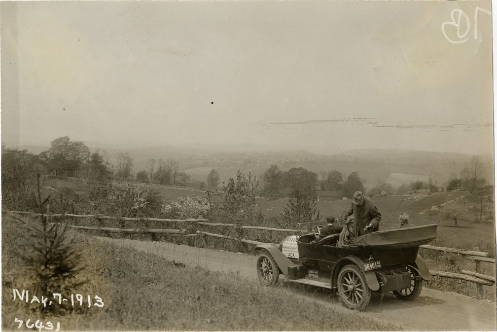View of motorists in National car at scenic overlook during the 1913 Overman tires 10,000 mile demonstration. The car was outfitted with a set of Overman cushion tires and driven over different routes and road surfaces within a 50 mile radius of New York, New York. Printed on front: "May-7-1913." Stamped on back: "Spooner & Wells, Inc., photographers, 1931 Broadway, N.Y. City, phones 3472-3473 Col." Handwritten on back: "Tours--Overman tires 10,000 mile demonstration, 1913."