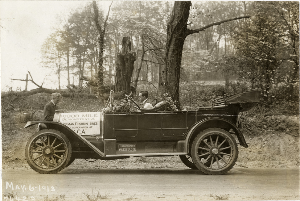 Motorists with National automobile on rural road, 1913 Overman tires 10,000 mile demonstration