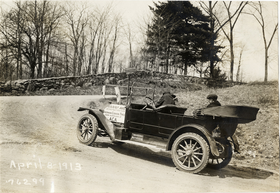 View of motorists in National car approaching stone wall on curve or road during the 1913 Overman tires 10,000 mile demonstration. The car was outfitted with a set of Overman cushion tires and driven over different routes and road surfaces within a 50 mile radius of New York, New York. Printed on front: "April-8-1913." Stamped on back: "Spooner & Wells, Inc., photographers, 1931 Broadway, N.Y. City, phones 3472-3473 Col." Handwritten on back: "Tours--Overman tires 10,000 mile demonstration, 1913."