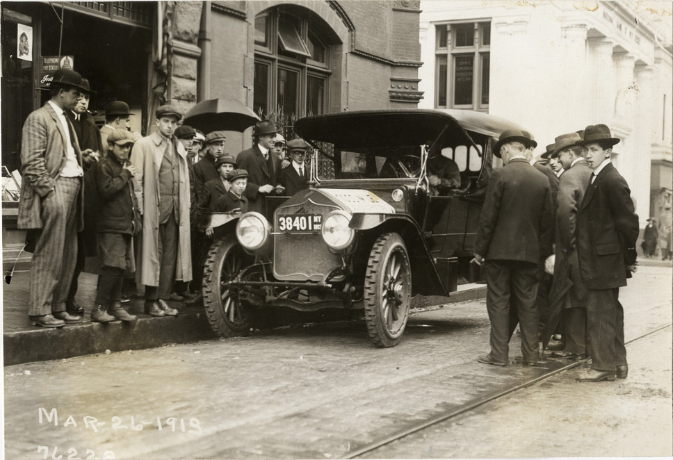 View of motorists in National car during the 1913 Overman tires 10,000 mile demonstration. The car was outfitted with a set of Overman cushion tires and driven over different routes and road surfaces within a 50 mile radius of New York, New York. Printed on front: "Mar-26-1913." Stamped on back: "Spooner & Wells, Inc., photographers, 1931 Broadway, N.Y. City, phones 3472-3473 Col." Handwritten on back: "Tours--Overman tires 10,000 mile demonstration, 1913."