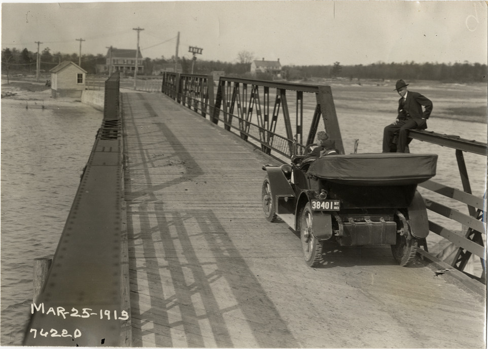 Rear view of motorists with National car on bridge during the 1913 Overman tires 10,000 mile demonstration. The car was outfitted with a set of Overman cushion tires and driven over different routes and road surfaces within a 50 mile radius of New York, New York. Printed on front: "Mar-25-1913." Stamped on back: "Spooner & Wells, Inc., photographers, 1931 Broadway, N.Y. City, phones 3472-3473 Col." Handwritten on back: "Tours--Overman tires 10,000 mile demonstration, 1913."