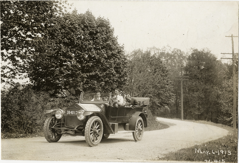 View of motorists in National car traveling on rural dirt road during the 1913 Overman tires 10,000 mile demonstration. Car is decorated with bunches of flowers. The car was outfitted with a set of Overman cushion tires and driven over different routes and road surfaces within a 50 mile radius of New York, New York. Printed on front: "May-6-1913." Stamped on back: "Spooner & Wells, Inc., photographers, 1931 Broadway, N.Y. City, phones 3472-3473 Col." Handwritten on back: "Tours--Overman tires 10,000 mile demonstration, 1913."