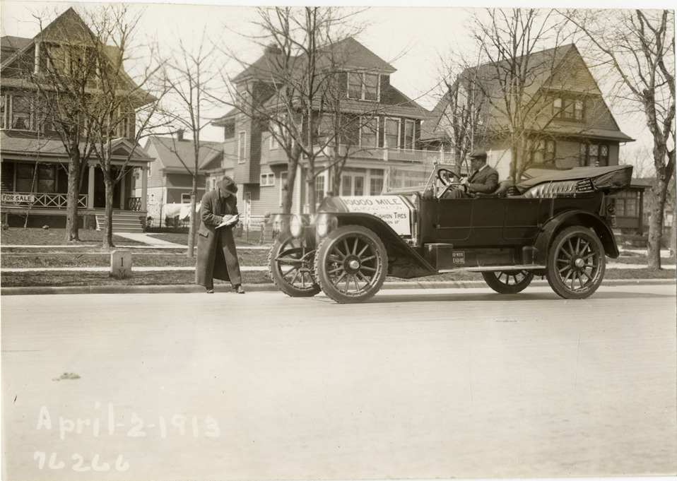View of motorists with National car on residential street during the 1913 Overman tires 10,000 mile demonstration. Houses in background. The car was outfitted with a set of Overman cushion tires and driven over different routes and road surfaces within a 50 mile radius of New York, New York. Printed on front: "April-2-1913." Stamped on back: "Spooner & Wells, Inc., photographers, 1931 Broadway, N.Y. City, phones 3472-3473 Col." Handwritten on back: "Tours--Overman tires 10,000 mile demonstration, 1913."