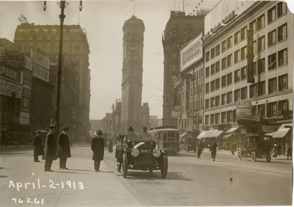 View of motorists posing in National car on city street during the 1913 Overman tires 10,000 mile demonstration. Commercial buildings and streetcar in background. The car was outfitted with a set of Overman cushion tires and driven over different routes and road surfaces within a 50 mile radius of New York, New York. Printed on front: "April-2-1913." Stamped on back: "Spooner & Wells, Inc., photographers, 1931 Broadway, N.Y. City, phones 3472-3473 Col." Handwritten on back: "Tours--Overman tires 10,000 mile demonstration, 1913."