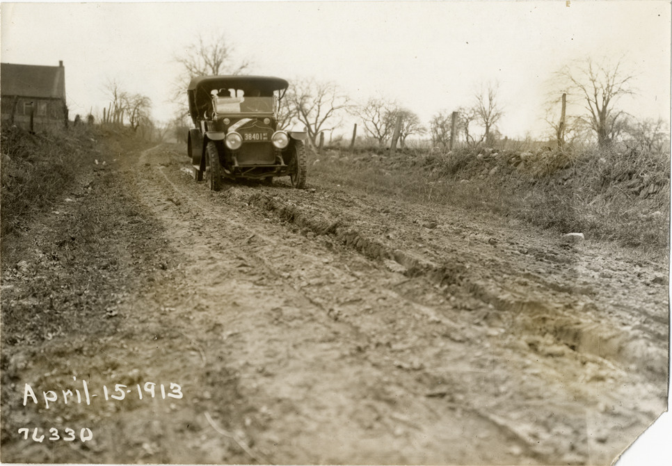 View of National car traveling on rutted rural dirt road during the 1913 Overman tires 10,000 mile demonstration. The car was outfitted with a set of Overman cushion tires and driven over different routes and road surfaces within a 50 mile radius of New York, New York. Printed on front: "April-15-1913." Handwritten on back: "Tours--Overman tires 10,000 mile demonstration, 1913."