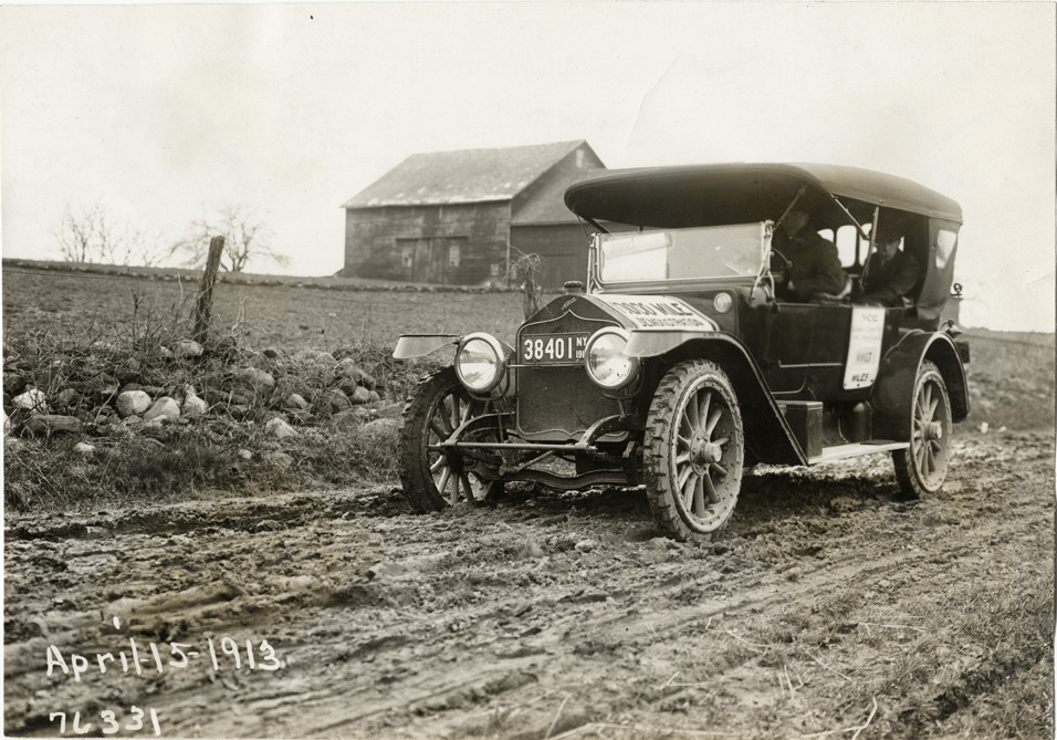 View of National car traveling on rural dirt road during the 1913 Overman tires 10,000 mile demonstration. Barn in background. The car was outfitted with a set of Overman cushion tires and driven over different routes and road surfaces within a 50 mile radius of New York, New York. Printed on front: "April-15-1913." Handwritten on back: "Tours--Overman tires 10,000 mile demonstration, 1913."