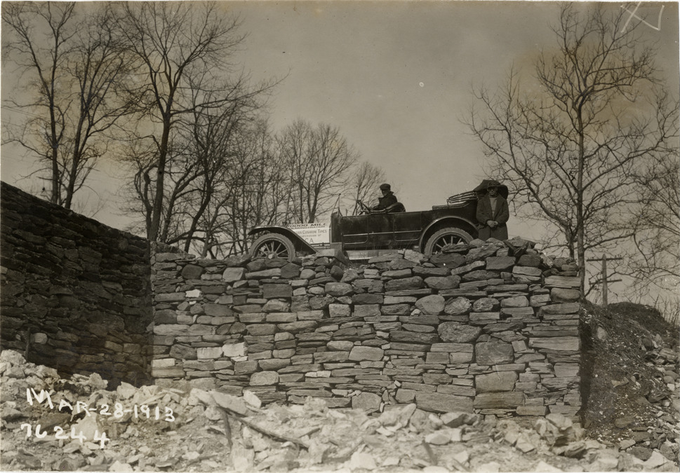 View of motorists posing with National car next to stone wall during the 1913 Overman tires 10,000 mile demonstration. The car was outfitted with a set of Overman cushion tires and driven over different routes and road surfaces within a 50 mile radius of New York, New York. Printed on front: "Mar-28-1913." Handwritten on back: "Tours--Overman tires 10,000 mile demonstration, 1913."