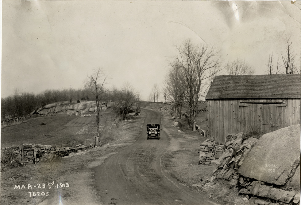 Distant view of National car traveling on rural dirt road during the 1913 Overman tires 10,000 mile demonstration. Barn on right. The car was outfitted with a set of Overman cushion tires and driven over different routes and road surfaces within a 50 mile radius of New York, New York. Printed on front: "Mar-23rd-1913." Stamped on back: "Spooner & Wells, Inc., photographers, 1931 Broadway, N.Y. City, phones 3472-3473 Col." Handwritten on back: "Tours--Overman tires 10,000 mile demonstration, 1913."