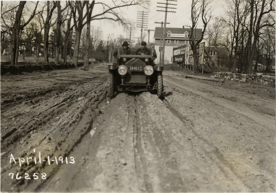 View of National car traveling on rutted rural dirt road during the 1913 Overman tires 10,000 mile demonstration. Sound View Hotel in background. The car was outfitted with a set of Overman cushion tires and driven over different routes and road surfaces within a 50 mile radius of New York, New York. Printed on front: "April-1-1913." Handwritten on back: "Tours--Overman tires 10,000 mile demonstration, 1913."