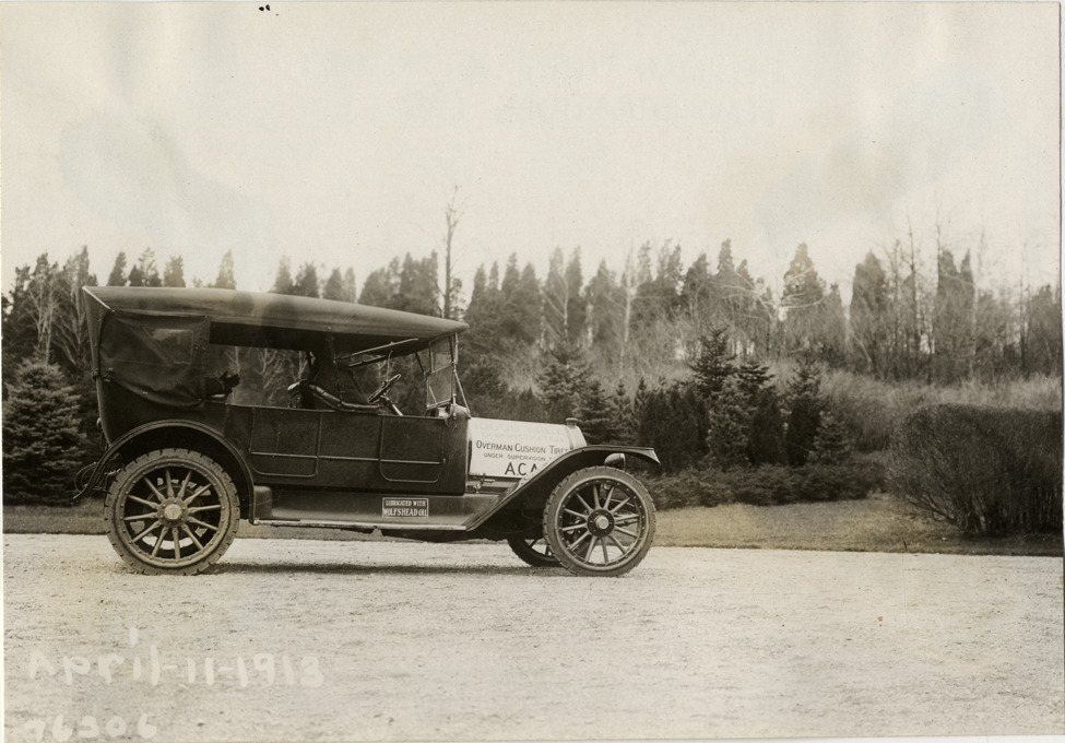 National automobile parked on driveway, 1913 Overman tires 10,000 mile demonstration