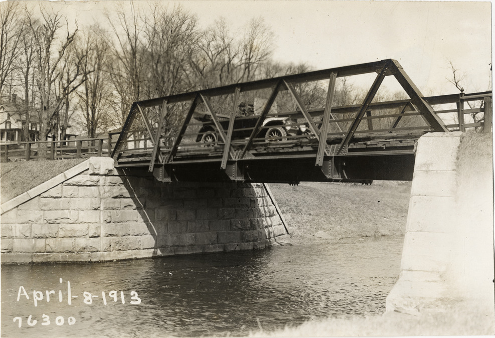 View of motorists in National car crossing bridge during the 1913 Overman tires 10,000 mile demonstration. The car was outfitted with a set of Overman cushion tires and driven over different routes and road surfaces within a 50 mile radius of New York, New York. Printed on front: "April-8-1913." Stamped on back: "Spooner & Wells, Inc., photographers, 1931 Broadway, N.Y. City, phones 3472-3473 Col." Handwritten on back: "Tours--Overman tires 10,000 mile demonstration, 1913."