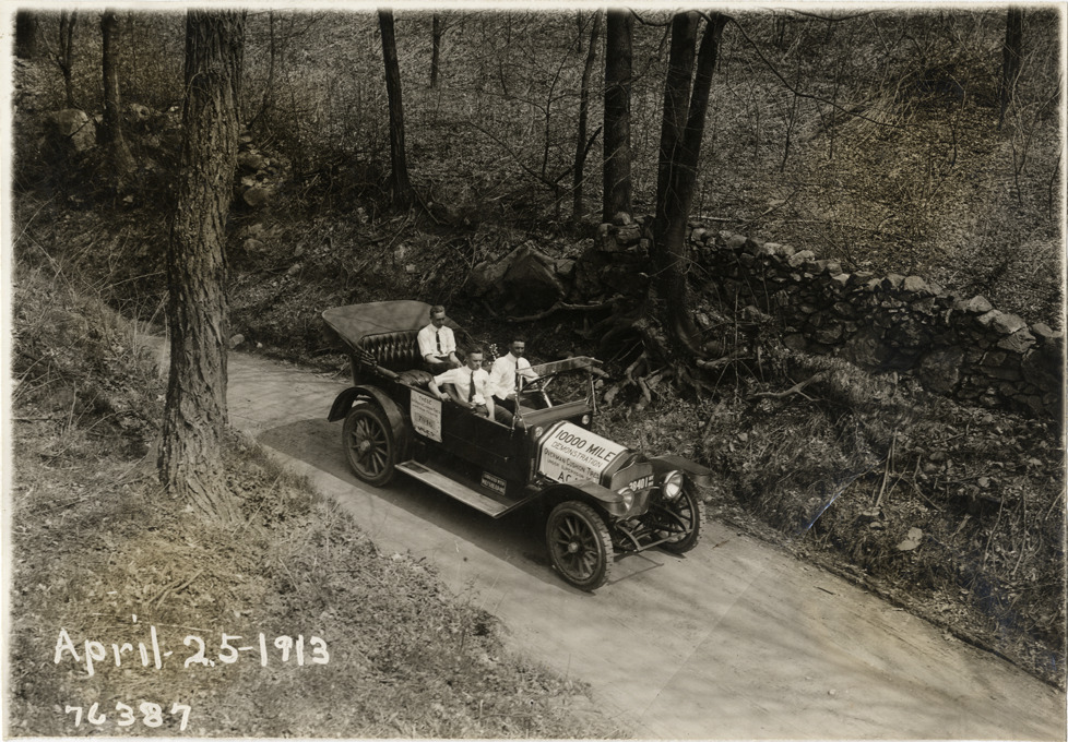 View of motorists in National car traveling on forest road during the 1913 Overman tires 10,000 mile demonstration. The car was outfitted with a set of Overman cushion tires and driven over different routes and road surfaces within a 50 mile radius of New York, New York. Printed on front: "April-25-1913." Stamped on back: "Spooner & Wells, Inc., photographers, 1931 Broadway, N.Y. City, phones 3472-3473 Col." Handwritten on back: "Tours--Overman tires 10,000 mile demonstration, 1913."