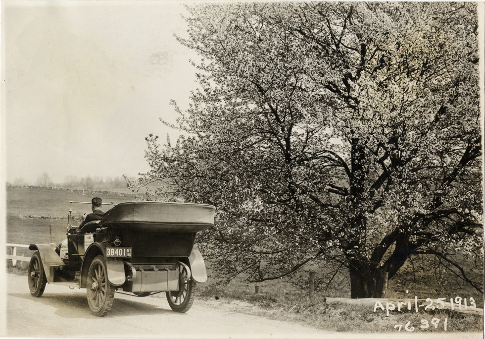 Rear view of motorists in National car passing flowering tree on roadside during the 1913 Overman tires 10,000 mile demonstration. The car was outfitted with a set of Overman cushion tires and driven over different routes and road surfaces within a 50 mile radius of New York, New York. Printed on front: "April-25-1913." Stamped on back: "Spooner & Wells, Inc., photographers, 1931 Broadway, N.Y. City, phones 3472-3473 Col." Handwritten on back: "Tours--Overman tires 10,000 mile demonstration, 1913."