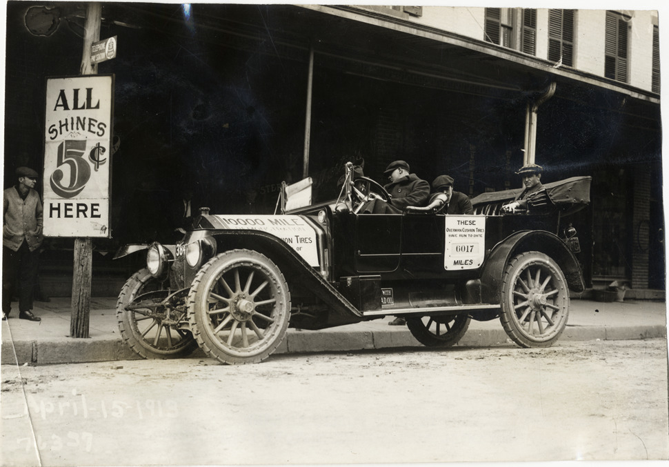 View of motorists in National car during the 1913 Overman tires 10,000 mile demonstration. "All shines 5 [cents] here" sign is displayed on post; sign on side of car reads: "These Overman cushion tires have run to date 6017 miles." The car was outfitted with a set of Overman cushion tires and driven over different routes and road surfaces within a 50 mile radius of New York, New York. Printed on front: "April-15-1913." Stamped on back: "Spooner & Wells, Inc., photographers, 1931 Broadway, N.Y. City, phones 3472-3473 Col." Handwritten on back: "Tours--Overman tires 10,000 mile demonstration, 1913."