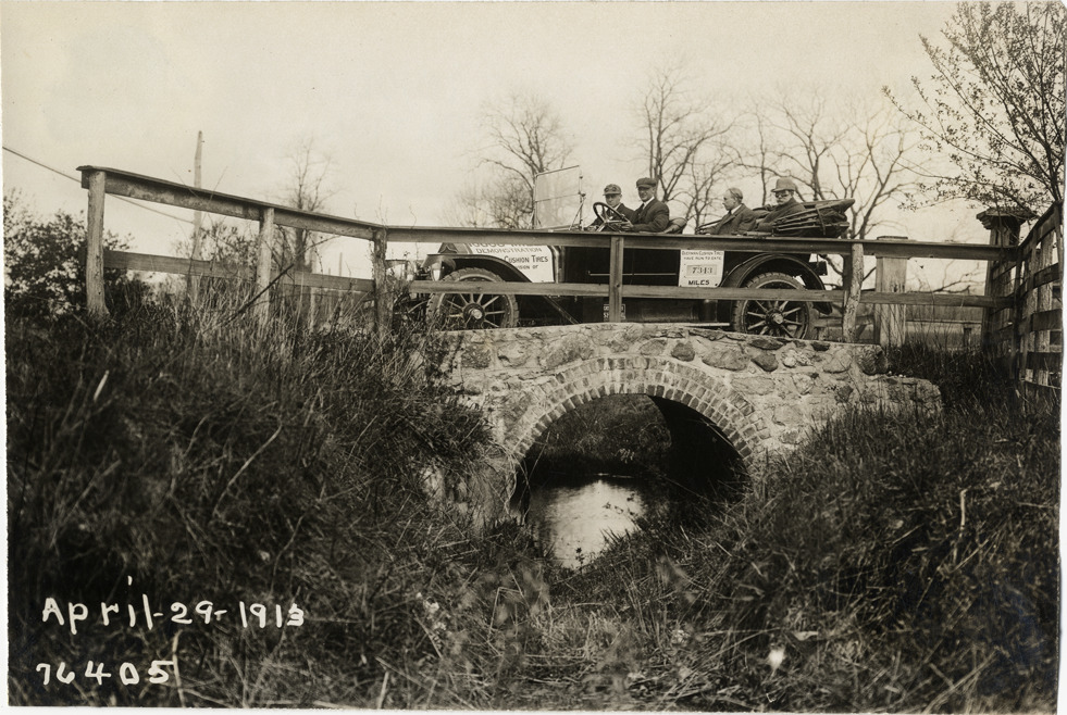 View of motorists posing in National car on stone bridge during the 1913 Overman tires 10,000 mile demonstration. The car was outfitted with a set of Overman cushion tires and driven over different routes and road surfaces within a 50 mile radius of New York, New York. Printed on front: "April-29-1913." Stamped on back: "Spooner & Wells, Inc., photographers, 1931 Broadway, N.Y. City, phones 3472-3473 Col." Handwritten on back: "Tours--Overman tires 10,000 mile demonstration, 1913."