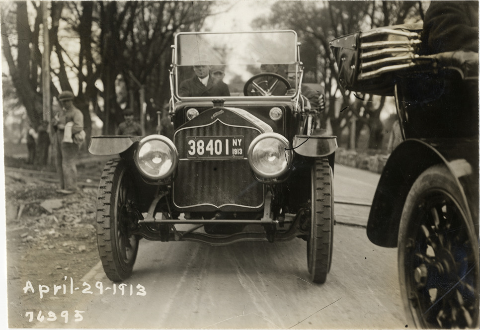 View of motorists in National car on rural dirt road during the 1913 Overman tires 10,000 mile demonstration. The car was outfitted with a set of Overman cushion tires and driven over different routes and road surfaces within a 50 mile radius of New York, New York. Printed on front: "April-29-1913." Stamped on back: "Spooner & Wells, Inc., photographers, 1931 Broadway, N.Y. City, phones 3472-3473 Col." Handwritten on back: "Tours--Overman tires 10,000 mile demonstration, 1913."