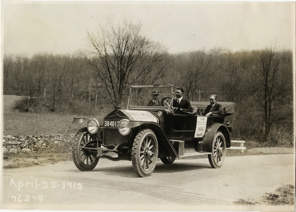 View of motorists posing in National car on rural road during the 1913 Overman tires 10,000 mile demonstration. The car was outfitted with a set of Overman cushion tires and driven over different routes and road surfaces within a 50 mile radius of New York, New York. Printed on front: "April-25-1913." Stamped on back: "Spooner & Wells, Inc., photographers, 1931 Broadway, N.Y. City, phones 3472-3473 Col." Handwritten on back: "Tours--Overman tires 10,000 mile demonstration, 1913."