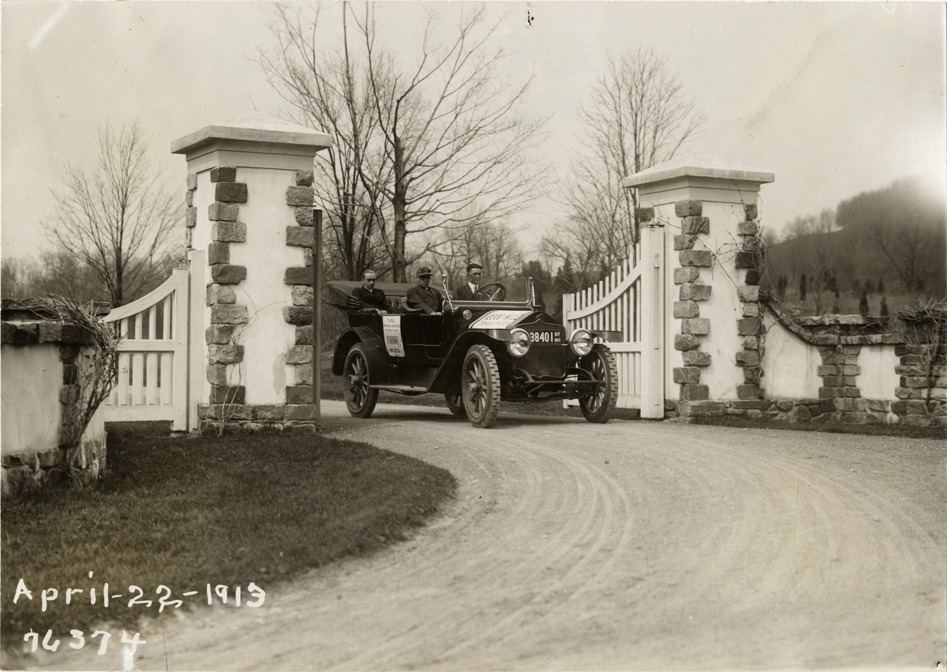 View of motorists in National car passing through gate during the 1913 Overman tires 10,000 mile demonstration. The car was outfitted with a set of Overman cushion tires and driven over different routes and road surfaces within a 50 mile radius of New York, New York. Printed on front: "April-22-1913." Stamped on back: "Spooner & Wells, Inc., photographers, 1931 Broadway, N.Y. City, phones 3472-3473 Col." Handwritten on back: "Tours--Overman tires 10,000 mile demonstration, 1913."