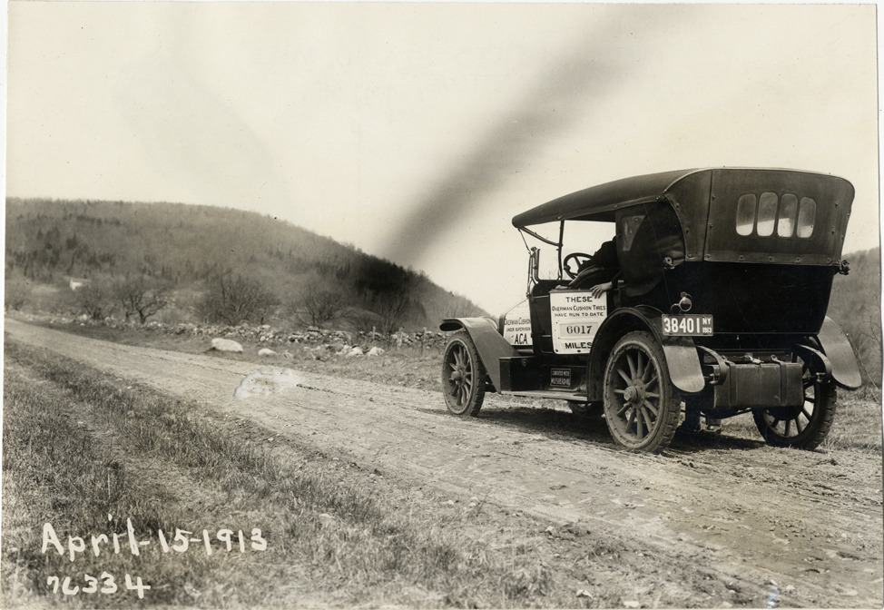 National automobile traveling on rural road, 1913 Overman tires 10,000 mile demonstration