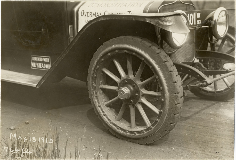 Close-up view of Overman tire on National car during the 1913 Overman tires 10,000 mile demonstration. The car was outfitted with a set of Overman cushion tires and driven over different routes and road surfaces within a 50 mile radius of New York, New York. Printed on front: "May-13-1913." Stamped on back: "Spooner & Wells, Inc., photographers, 1931 Broadway, N.Y. City, phones 3472-3473 Col." Handwritten on back: "Tours--Overman tires 10,000 mile demonstration, 1913."