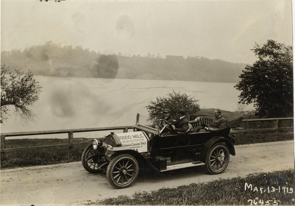 Motorists in National automobile on road overlooking river, 1913 Overman tires 10,000 mile demonstration