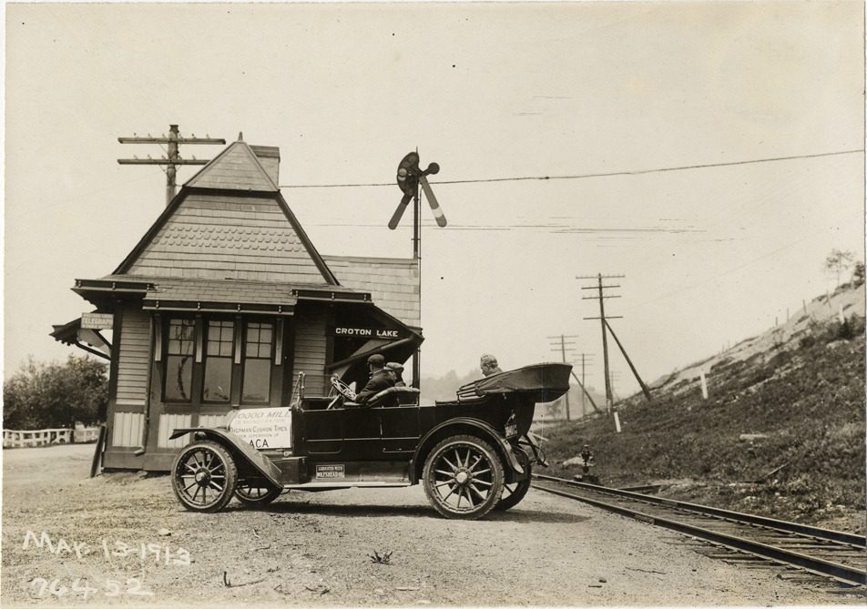 Motorists in National automobile in front of Croton Lake train station, 1913 Overman tires 10,000 mile demonstration