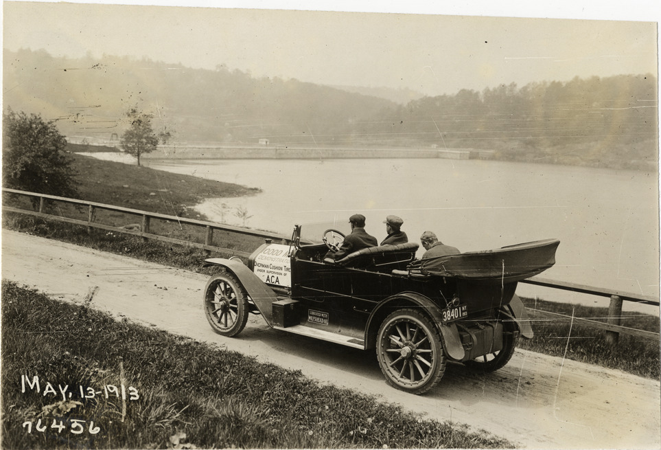 View of motorists in National car looking at dam during the 1913 Overman tires 10,000 mile demonstration. The car was outfitted with a set of Overman cushion tires and driven over different routes and road surfaces within a 50 mile radius of New York, New York. Printed on front: "May-13-1913." Stamped on back: "Spooner & Wells, Inc., photographers, 1931 Broadway, N.Y. City, phones 3472-3473 Col." Handwritten on back: "Tours--Overman tires 10,000 mile demonstration, 1913."