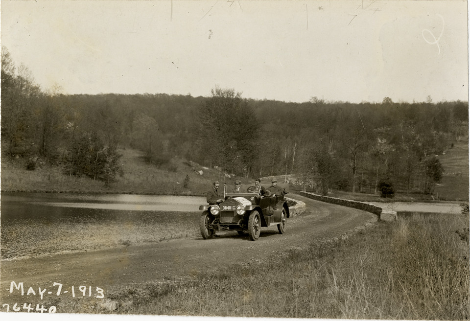 View of motorists with National car on road that crosses over river during the 1913 Overman tires 10,000 mile demonstration. The car was outfitted with a set of Overman cushion tires and driven over different routes and road surfaces within a 50 mile radius of New York, New York. Printed on front: "May-7-1913." Stamped on back: "Spooner & Wells, Inc., photographers, 1931 Broadway, N.Y. City, phones 3472-3473 Col." Handwritten on back: "Tours--Overman tires 10,000 mile demonstration, 1913."