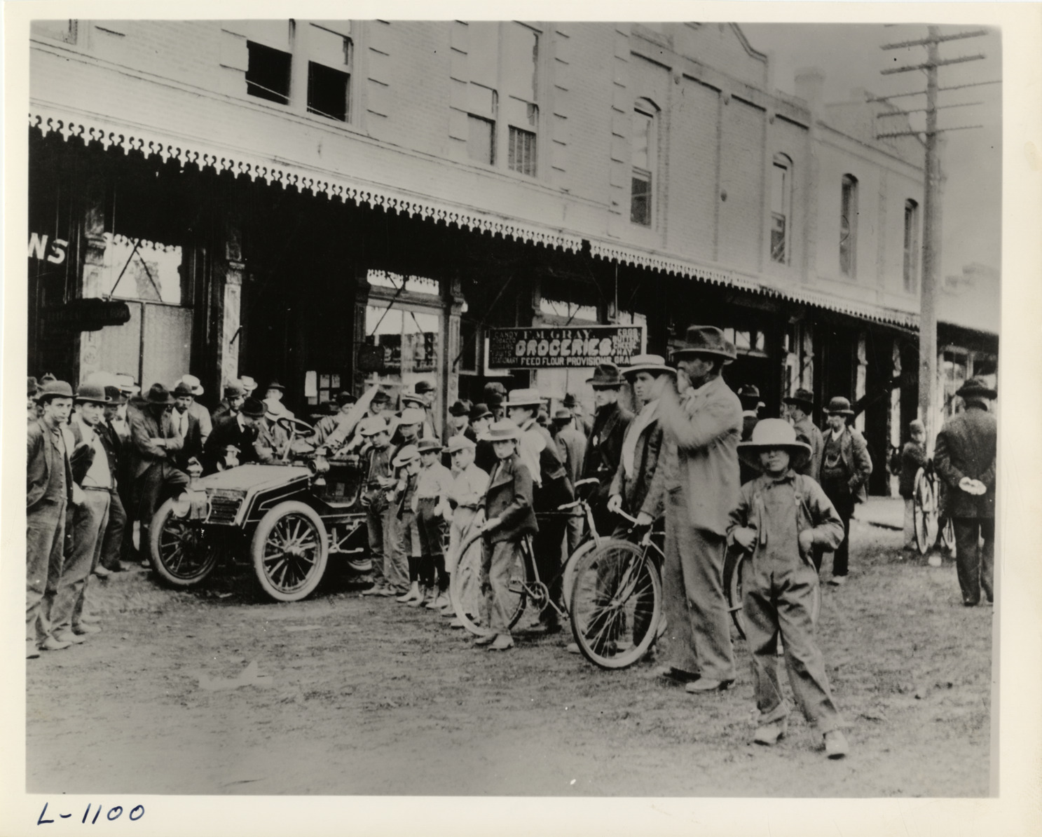 Spectators posing with Packard "Old Pacific" automobile, 1903 Packard Transcontinental Tour