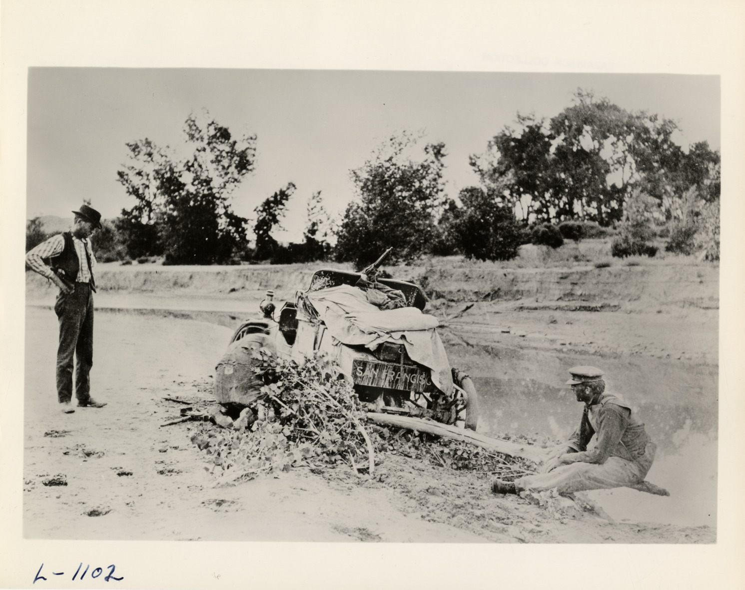 View of two men trying to dislodge Packard "Old Pacific" car from mud during the 1903 Packard Transcontinental Tour. Handwritten on back: "A fence rail serves as a lever, with leaves and brush packed under the wheels of Old Pacific to help it out of the mud on its historic cross-country run. Tours--Packard Transcontinental Tour, 1903."