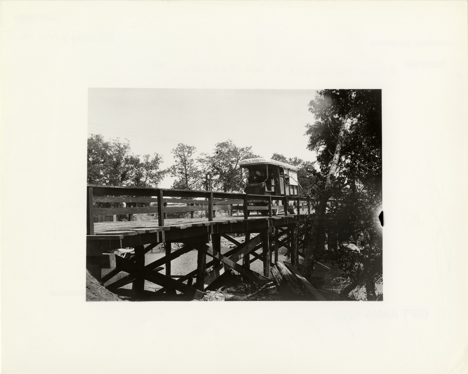 View of Alco truck owned by the Chas. W. Young & Co. of Philadelphia, Pennsylvania crossing wooden trestle bridge during the first transcontinental delivery of merchandise in 1912. Handwritten on back: "Tours--Philadelphia to San Francisco, 1912. 1st transcontinental delivery of merchandise by motor truck."