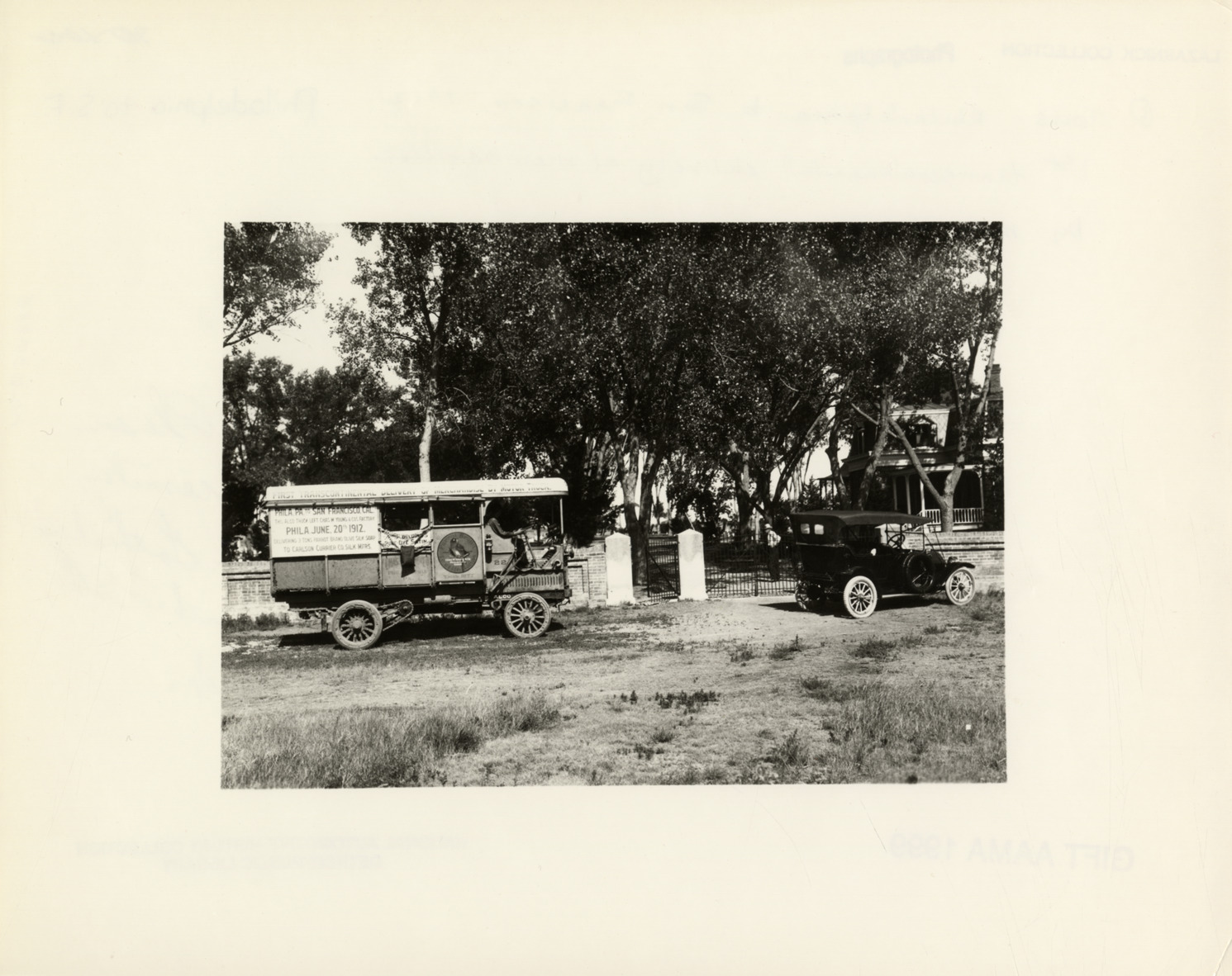 View of Alco truck owned by the Chas. W. Young & Co. of Philadelphia, Pennsylvania and unidentified car in front of the Fort McPherson National Cemetery in Nebraska during the first transcontinental delivery of merchandise in 1912. Handwritten on back: "Fort McPherson military cemetery between Gothenberg and North Platte, Neb. Tours--Philadelphia to San Francisco, 1912. 1st transcontinental delivery of merchandise by motor truck."