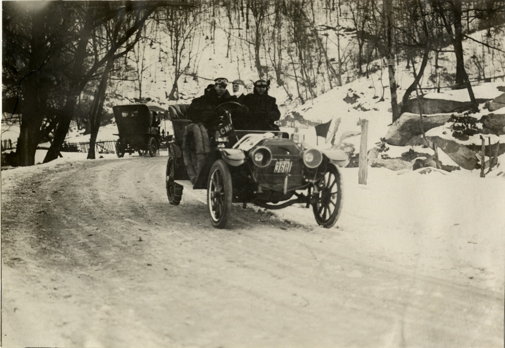 Motorists in automobile traveling on snow-covered road at Devil's Elbow, 1909 Philadelphia to Wilkes-Barre endurance run