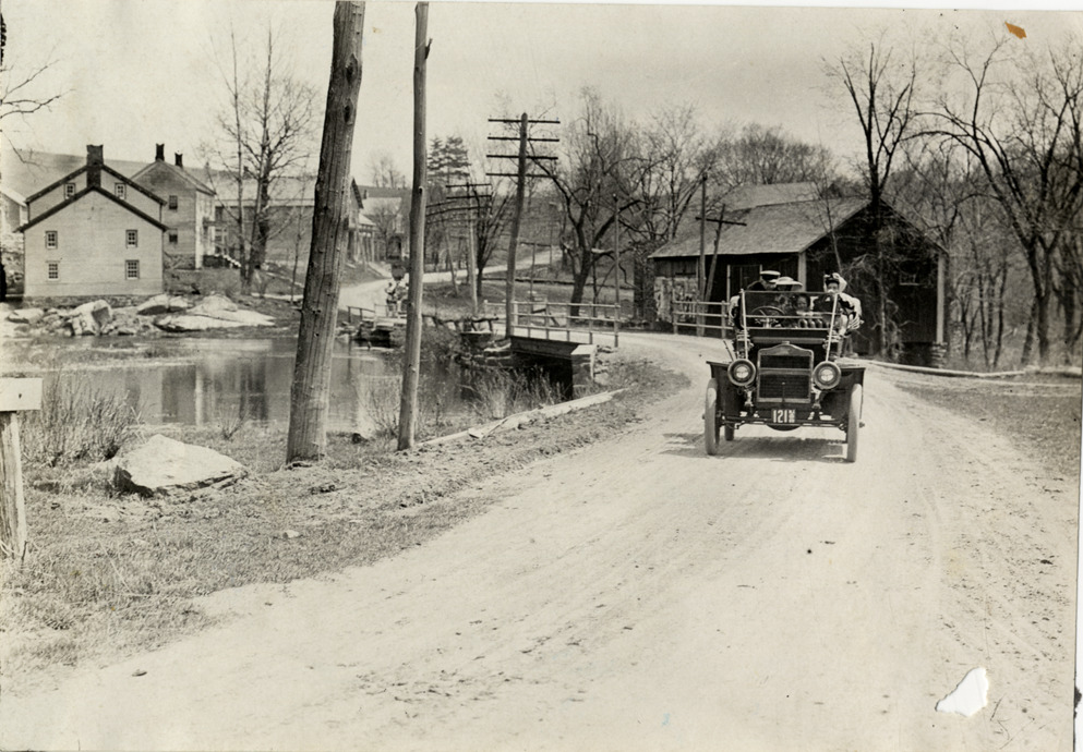 View of motorists in car traveling on rural dirt road between Chester, Pennsylvania and German Valley, New Jersey during the 1909 endurance run from Philadelphia to Wilkes-Barre, Pennsylvania. Bridge in background. Sponsored by the Quaker City Motor Club, the contest followed a route through Pennsylvania and New Jersey. Stamped on back: "Spooner & Wells, Inc., photographers, telephones 3472-3473 Columbus, 1931 Broadway, New York." Handwritten on back: "Between Chester and German Valley. Tours--Philadelphia to Wilkes-Barre, 1909."