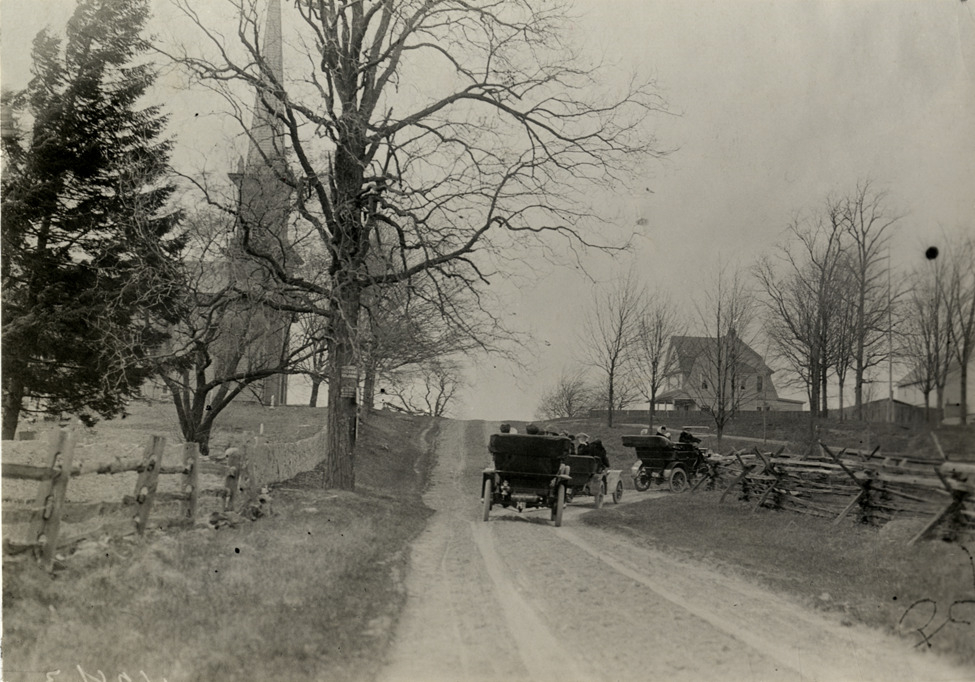 Rear view of cars turning on rural dirt road during the 1909 endurance run from Philadelphia to Wilkes-Barre, Pennsylvania. Church building in background. Sponsored by the Quaker City Motor Club, the contest followed a route through Pennsylvania and New Jersey. Stamped on back: "Spooner & Wells, Inc., photographers, telephones 3472-3473 Columbus, 1931 Broadway, New York." Handwritten on back: "Cars turning to right when within [undecipherable] church. Tours--Philadelphia to Wilkes-Barre, 1909."