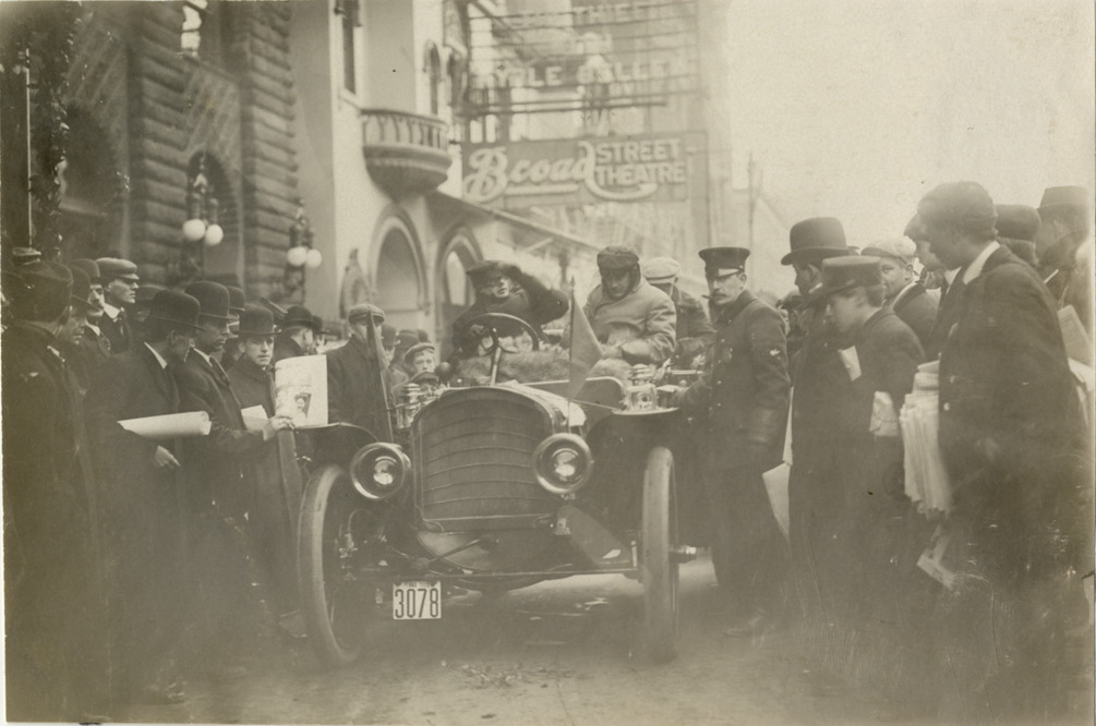 View of spectators surrounding motorists in car at Philadelphia during the 1909 endurance run from Philadelphia to Wilkes-Barre, Pennsylvania. Broad Street Theatre in background. Sponsored by the Quaker City Motor Club, the contest followed a route through Pennsylvania and New Jersey. Stamped on back: "Spooner & Wells, Inc., photographers, telephones 3472-3473 Columbus, 1931 Broadway, New York." Handwritten on back: "Tours--Philadelphia to Wilkes-Barre, 1909."