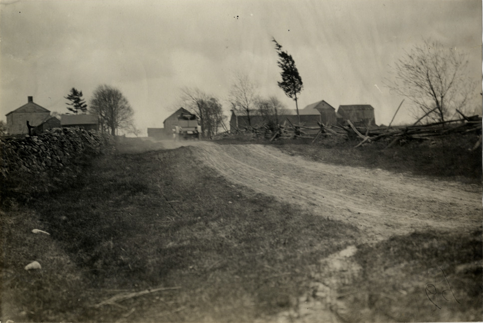 Rear view of car traveling on rural dirt road during the 1909 endurance run from Philadelphia to Wilkes-Barre, Pennsylvania. Farm buildings in background. Sponsored by the Quaker City Motor Club, the contest followed a route through Pennsylvania and New Jersey. Stamped on back: "Spooner & Wells, Inc., photographers, telephones 3472-3473 Columbus, 1931 Broadway, New York." Handwritten on back: "Tours--Philadelphia to Wilkes-Barre, 1909."