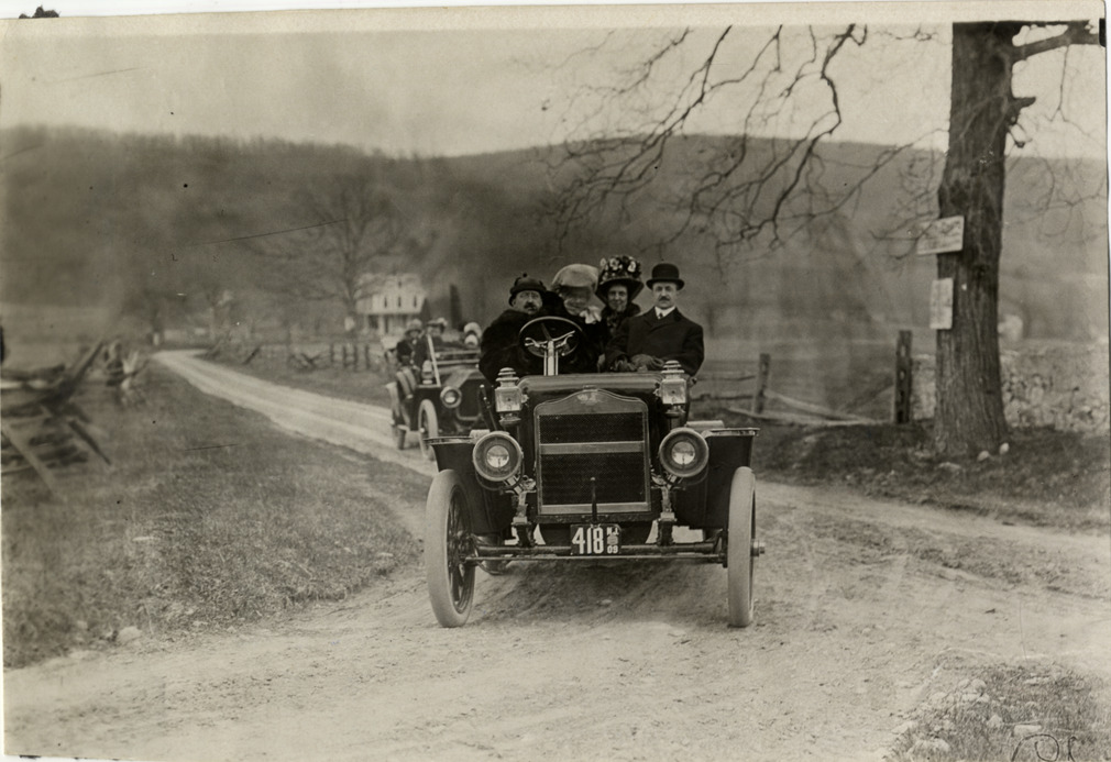Joseph H. Wood and motorists posing in automobile on rural road, 1909 Philadelphia to Wilkes-Barre endurance run