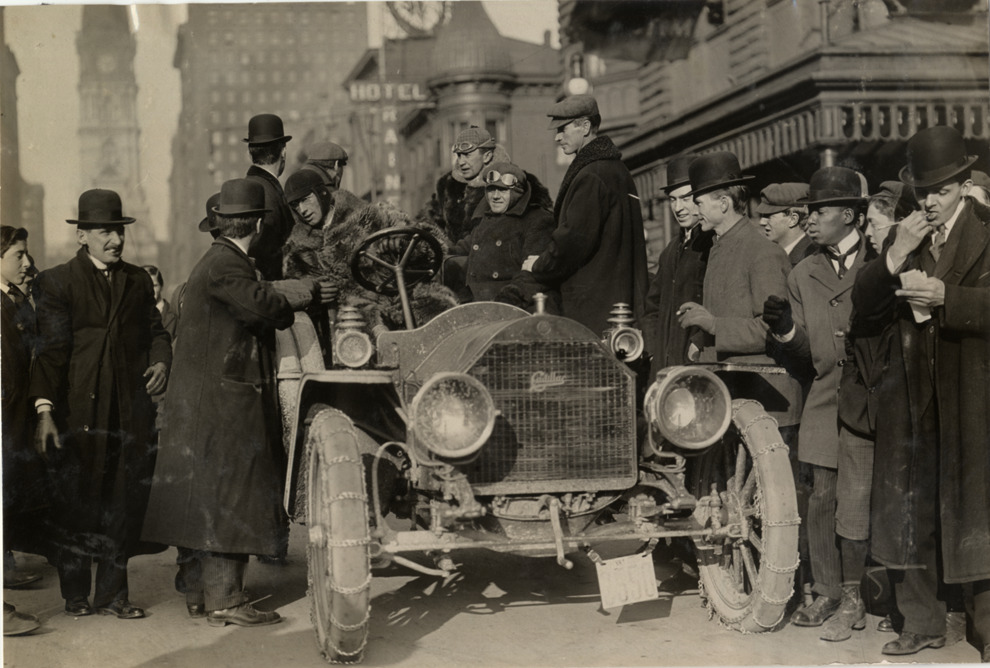 View of spectators surrounding motorists in Cadillac car during the 1909 endurance run from Philadelphia to Wilkes-Barre, Pennsylvania. Sponsored by the Quaker City Motor Club, the contest followed a route through Pennsylvania and New Jersey. Stamped on back: "Spooner & Wells, Inc., photographers, telephones 3472-3473 Columbus, 1931 Broadway, New York." Handwritten on back: "Tours--Philadelphia to Wilkes-Barre, 1909."