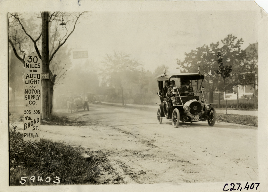 View of motorists in Franklin car at Hammonton, New Jersey during the 1910 Quaker City Motor Club Roadability Run. Sign on roadside reads: "30 miles to the Auto Light and Motor Supply Co., 506-508 N'th. Broad St., Phila." The endurance contest covered a route from Philadelphia, Pennsylvania to Atlantic City, New Jersey. Stamped on back: "Spooner & Wells, Inc., photographers, telephones 3472-3473 Columbus, 1931 Broadway, New York." Handwritten on back: "Pauls Franklin, Hammonton. Tours--Quaker City Motor Club Roadability Run, 1910."