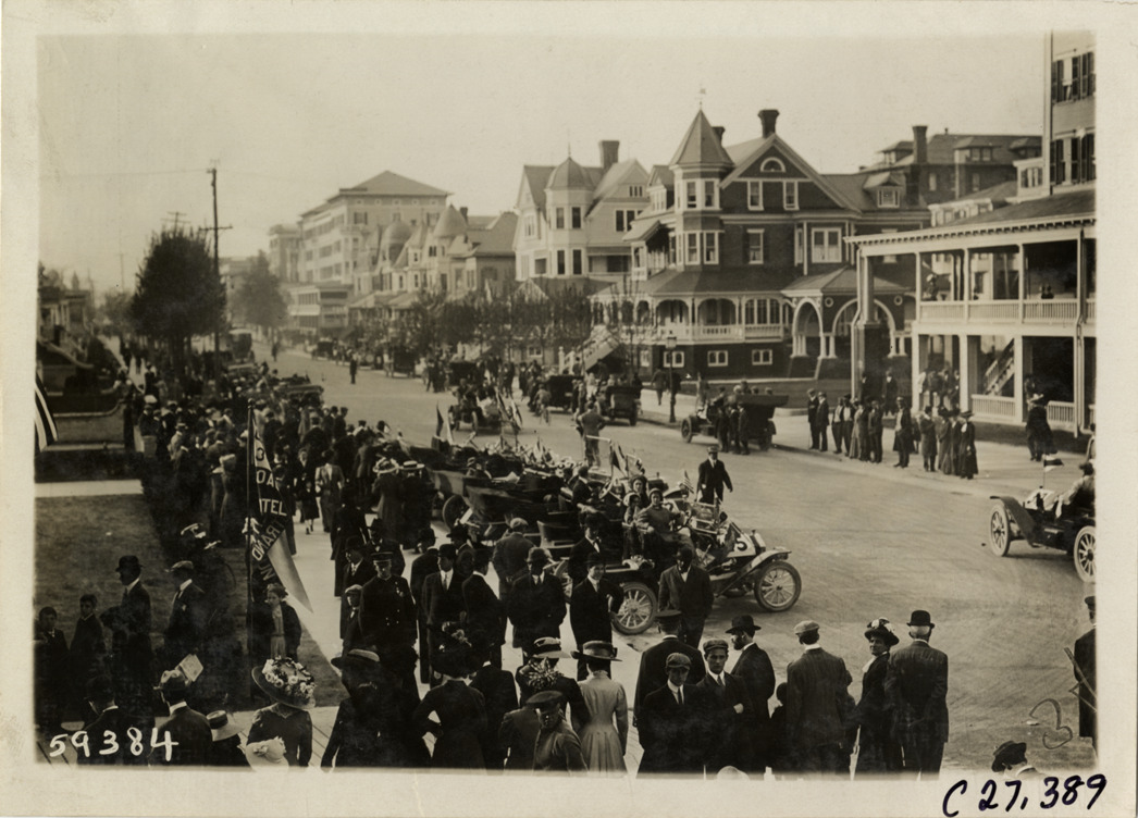 View of cars lined up in street at Atlantic City, New Jersey during the 1910 Quaker City Motor Club Roadability Run. Spectators stand on sidewalks; hotels in background. The endurance contest covered a route from Philadelphia, Pennsylvania to Atlantic City, New Jersey. Stamped on back: "Spooner & Wells, Inc., photographers, telephones 3472-3473 Columbus, 1931 Broadway, New York." Handwritten on back: "Tours--Quaker City Motor Club Roadability Run, 1910."